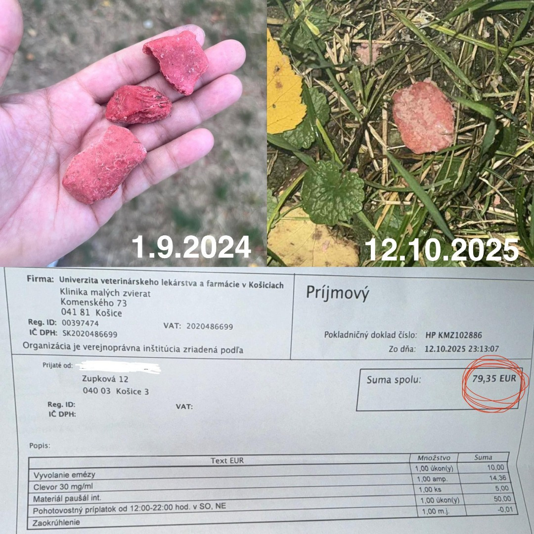 Obyvateľka sídliska Furča priložila faktúru u veterinára, ktorá hovorí za všetko. Tento jed ohrozuje nielen zvieratá, ale aj deti. (Zdroj: Fb Furča)