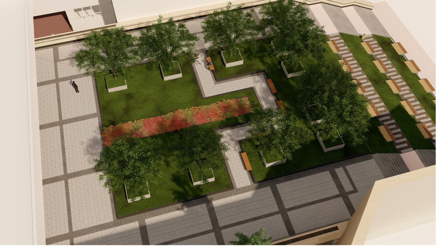 Druhú časť vegetačnej plochy bude riešená ako zatrávnená plocha s centrálnym parterom, ktorý bude tvoriť pestrá zmes kvitnúcich trvaliek. Pôjde o vodozádržné opatrenia na adaptácie zmeny klímy.Chodník s lavičkami bude lemovaný nízkou zeleňou a svetelnými prvkami, ktoré zvýraznia tento verejný priestor aj vo večerných hodinách. Zároveň tam vznikne ideálne miesto na oddych a stretávanie.
