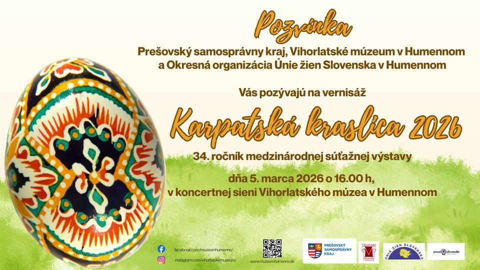 Vihorlatské múzeum v Humennom v spolupráci s Okresnou organizáciou Únie žien Slovenska organizuje 34. ročník medzinárodnej súťažnej výstavy Karpatská kraslica 2026.