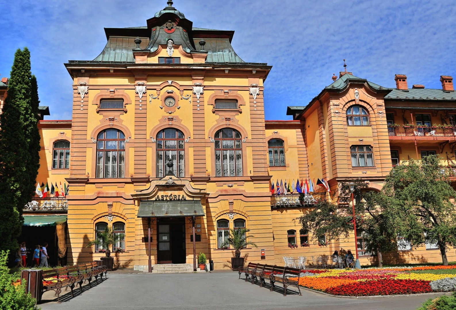 Hotel Astória: Ikonický architektonický skvost v srdci kúpeľov, známy svojou unikátnou atmosférou a blízkosťou k hlavnej kolonáde a pitným prameňom.