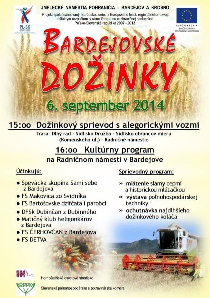V sobotu 6.9.2014 sa v Bardejove uskutočnia bardejovské dožinky - pripravený bude bohatý sprievodný program, uskutoční sa aj sprievod mestom cez Dlhý rad, sídlisko Družba a sídlisko Obrancov mieru na Radničné námestie. Podrobný program sa dozviete tu: http://ahoj.tv/kalendar/detail/158/bardejovske_dozinky.html