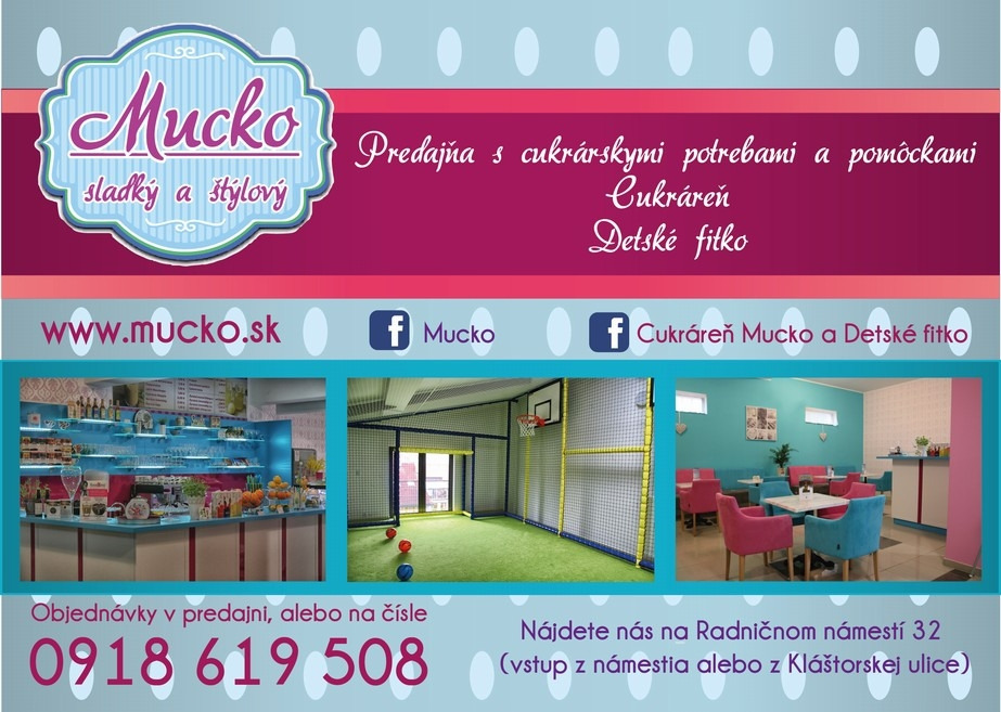 Predajňa s cukrárskymi potrebami Mucko sa prednedávnom presťahovala z Hurbanovej ulice do nových priestorov, na Radničné námestie 32, v novej budove za Irish Pubom. V nových a väčších priestoroch zákazníci okrem predajne nájdu aj cukráreň a detské fitko.