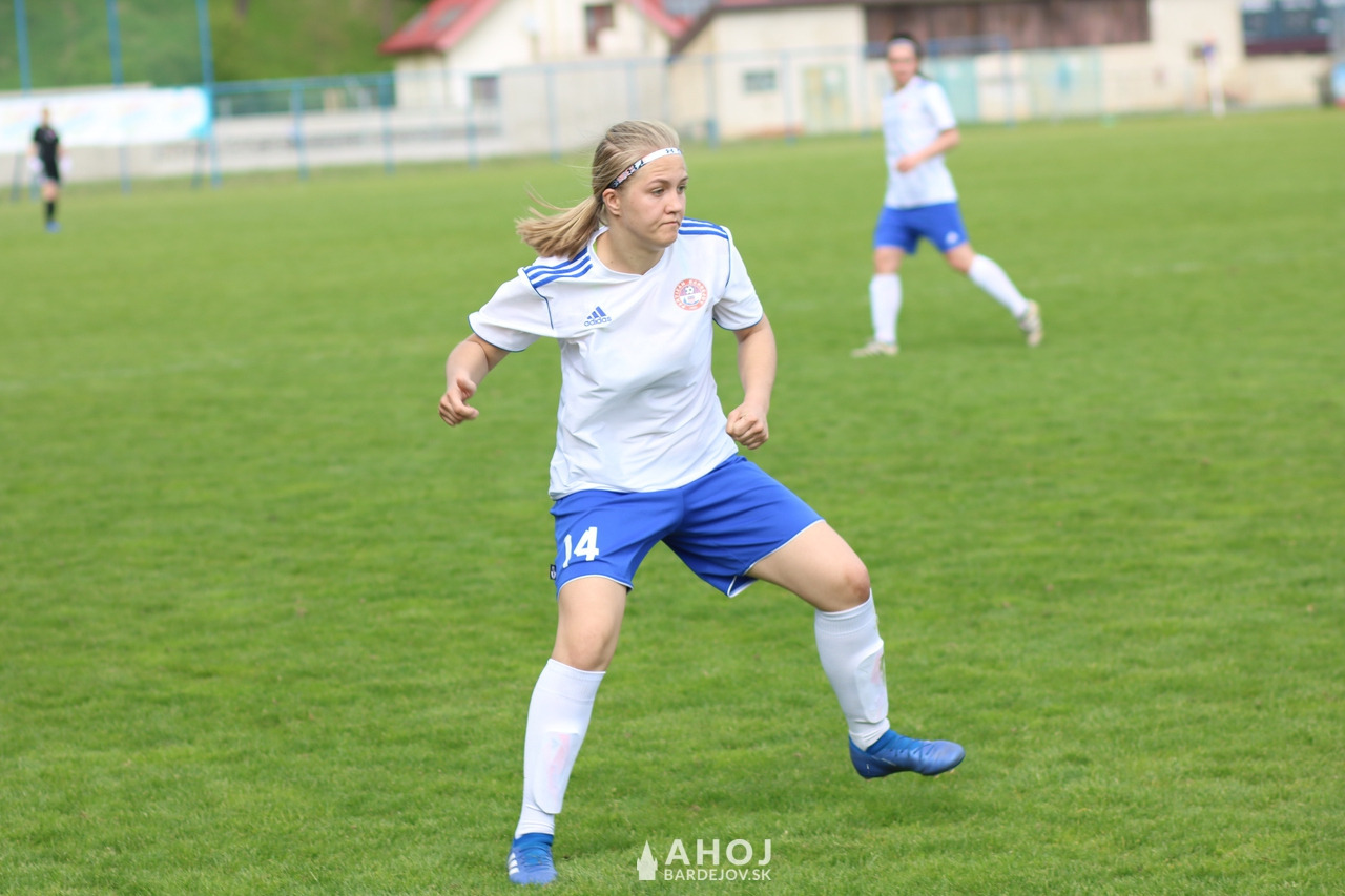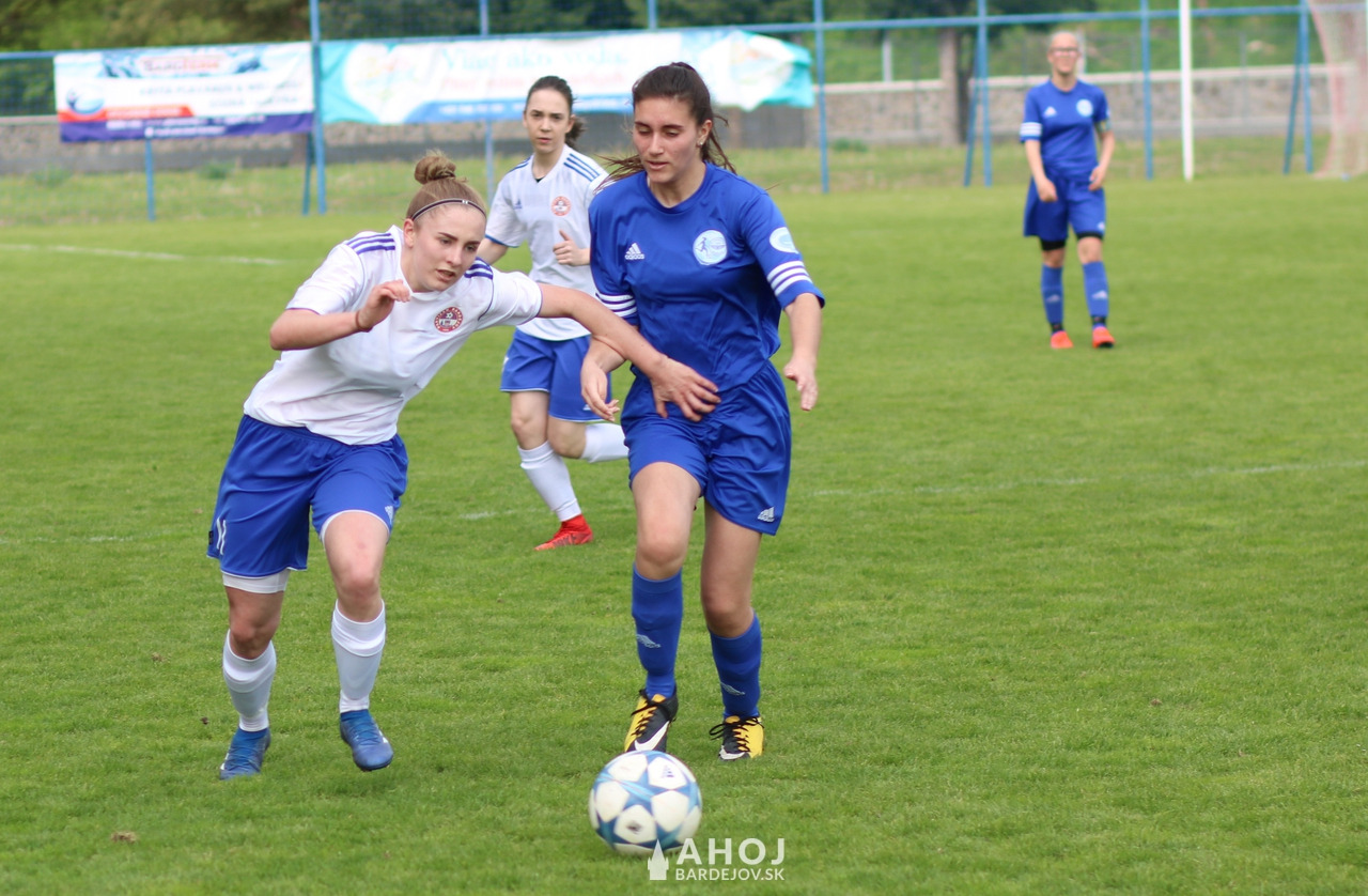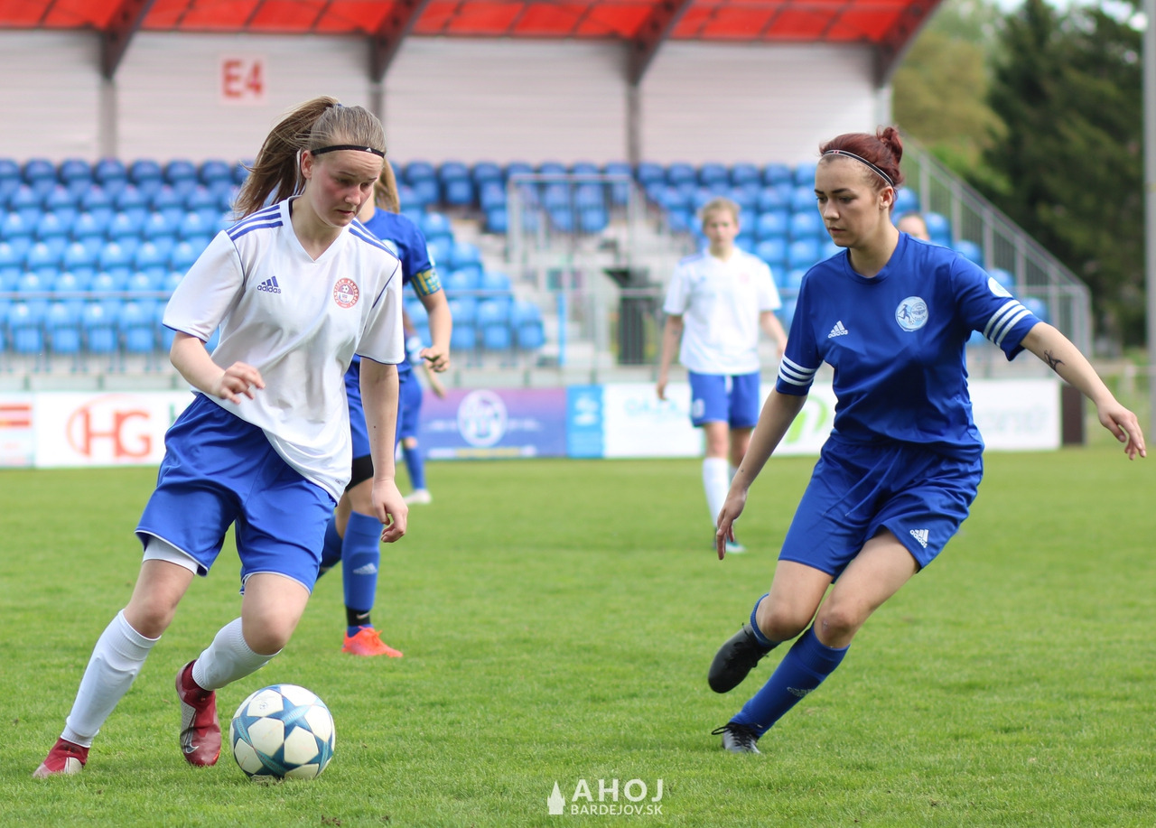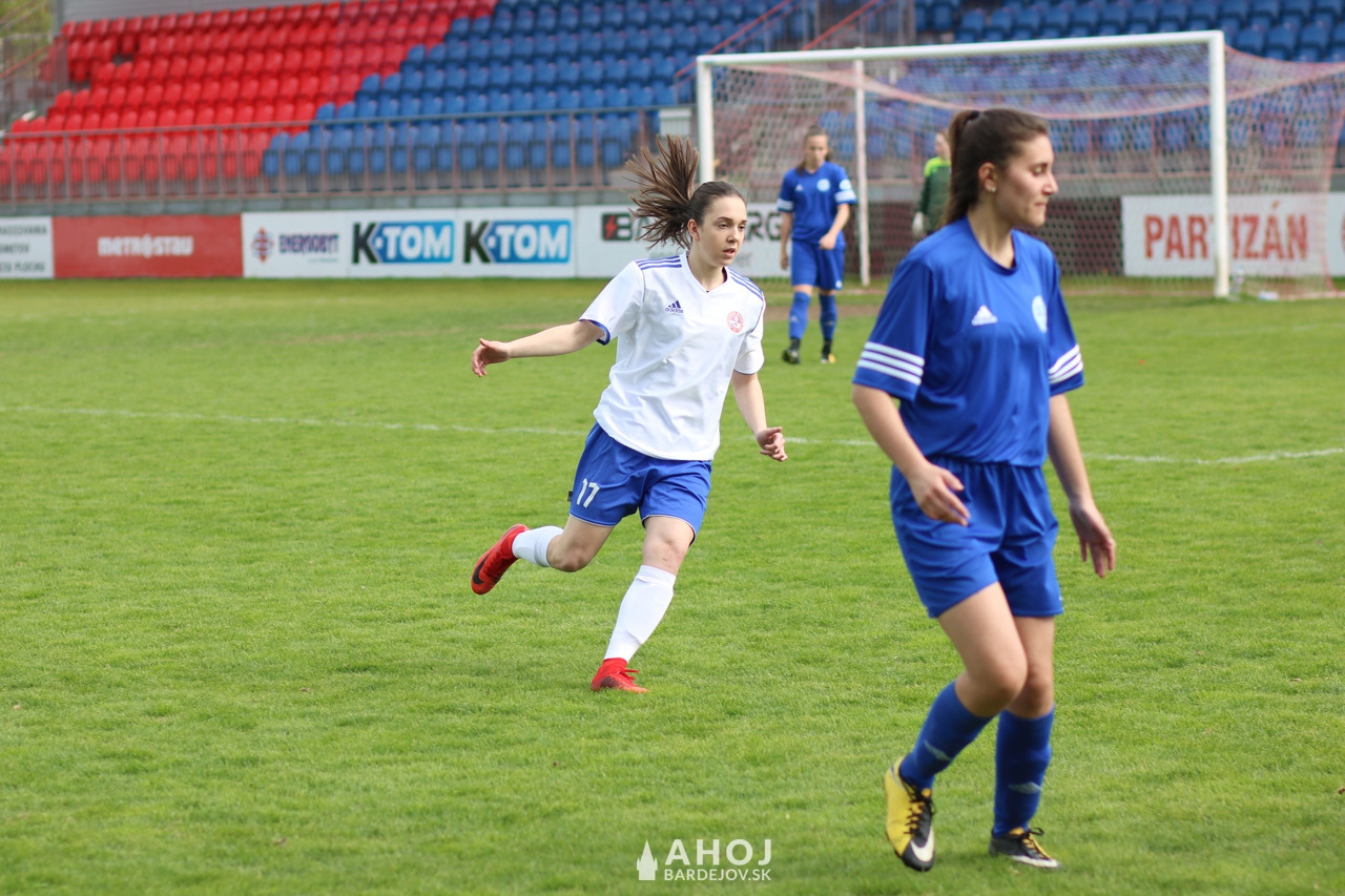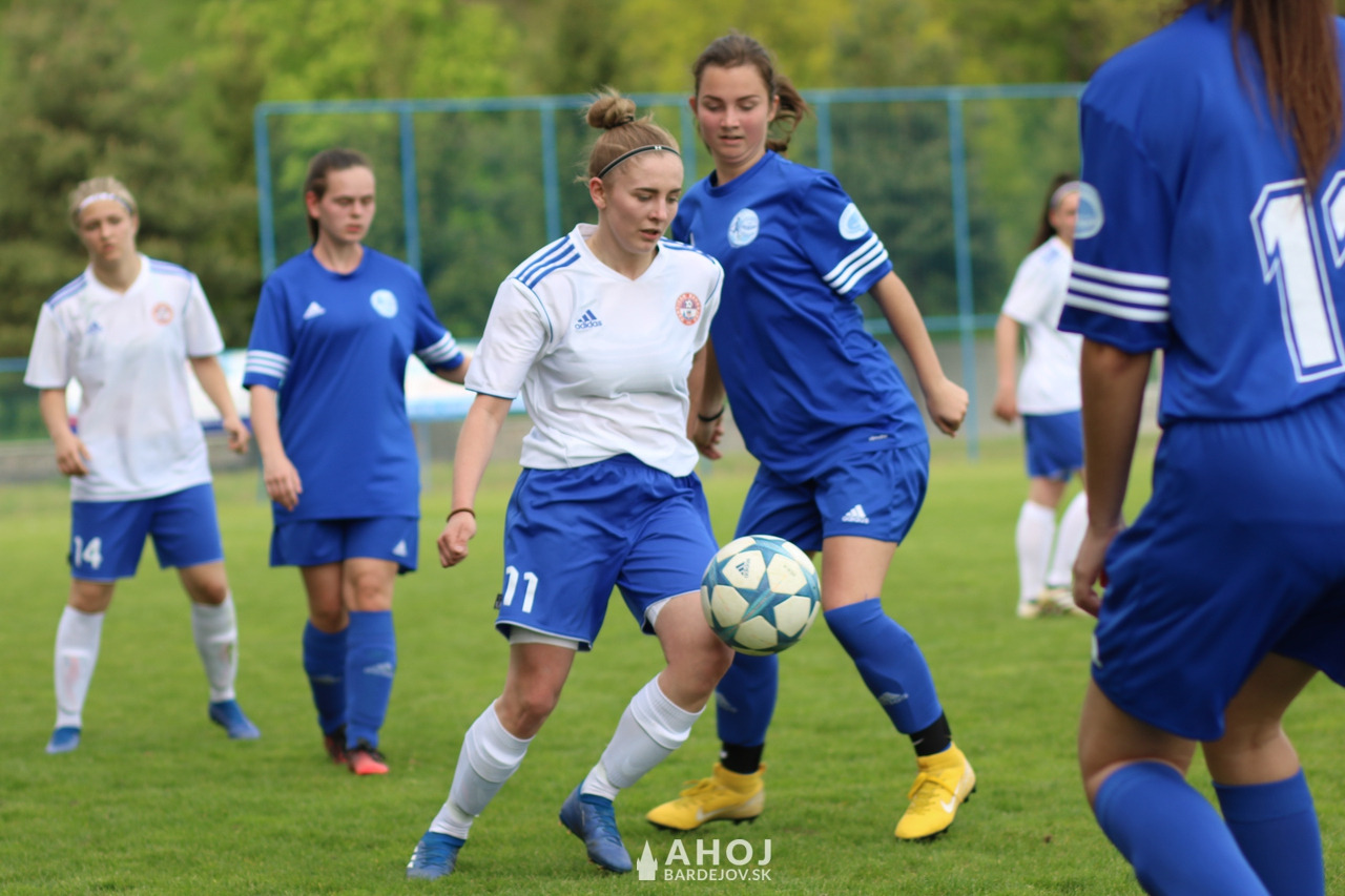 Pri lopte jedna z najlepších futbalistiek Bardejova, Viktória Mattová (v bielom, s číslom 11)
