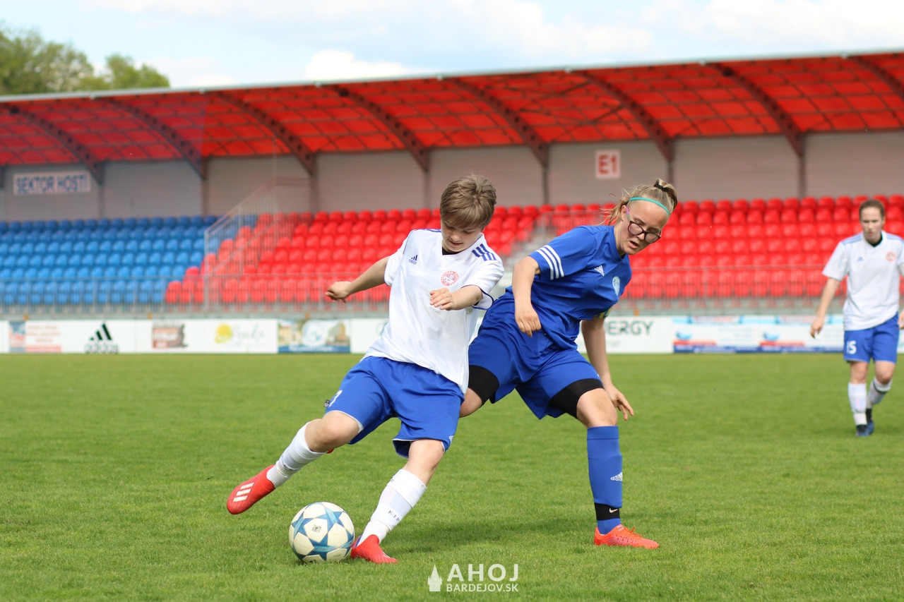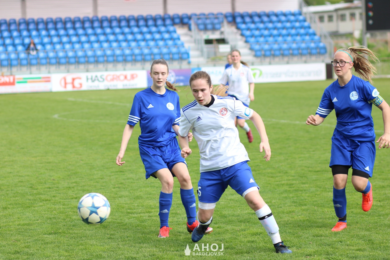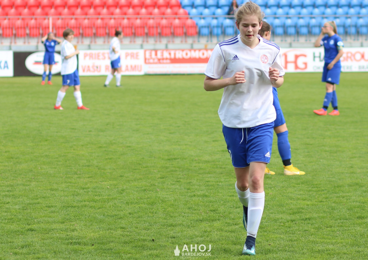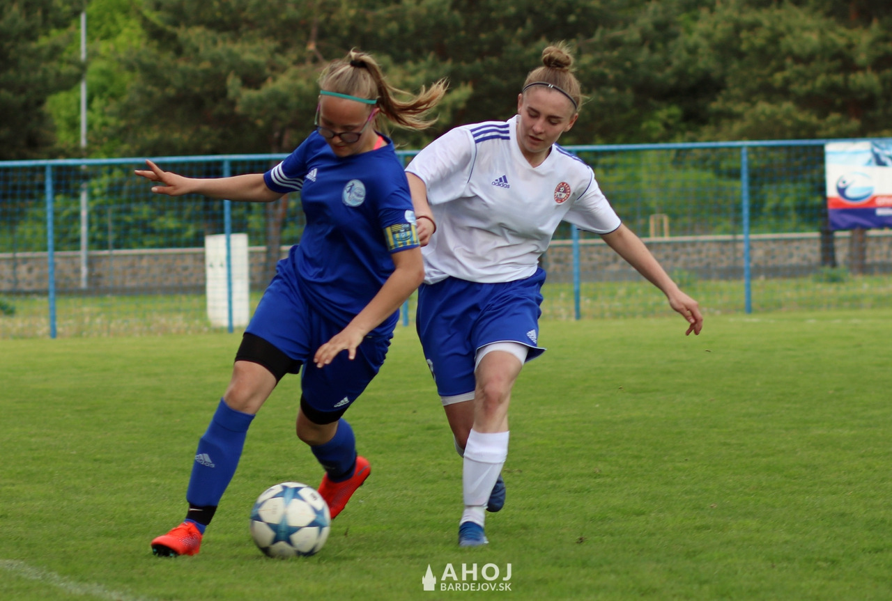 Pri lopte jedna z najlepších futbalistiek Bardejova, Viktória Mattová (v bielom, s číslom 11)