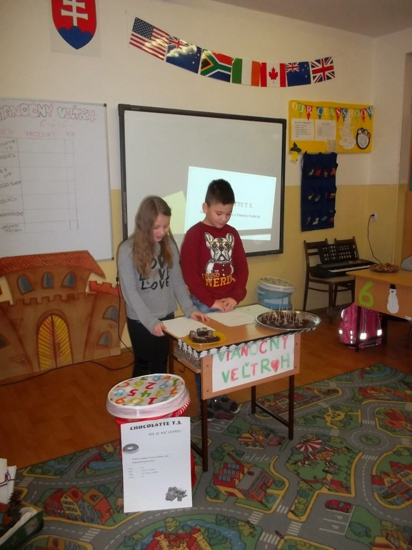 V priestoroch triedy sa v utorok 16. 12. 2014 predstavilo šesť konkurenčných a ozaj silných firiem. Prvá s názvom Chocolate T.S. priniesla na trh špeciálne koláčiky, ktorých ingrediencie boli dovezené priamo z Pluta. Ochutnávka bola v podnikateľskej stratégii firmy Timka a Sárky dominantná, preto sme si všetci na koláčikoch výborne pochutili, pričom časť financií z vyzbieraných koláčikov plánujú v budúcnosti zástupcovia firmy venovať opusteným psíkom.