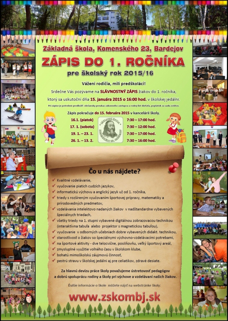 Vážení rodičia, milí predškoláci! Základná škola na Komenského ul. V Bardejove vás srdečne pozýva na zápis žiakov do 1. ročníka, ktorý sa začína dňa 15.1.2015 o 7:30 hod. a pokračuje do 15. februára 2015 v kancelárii školy.