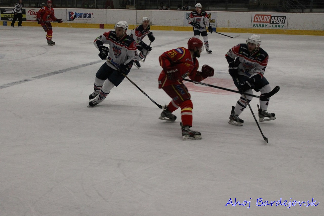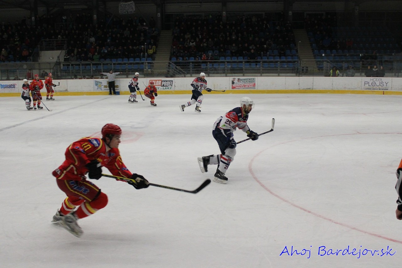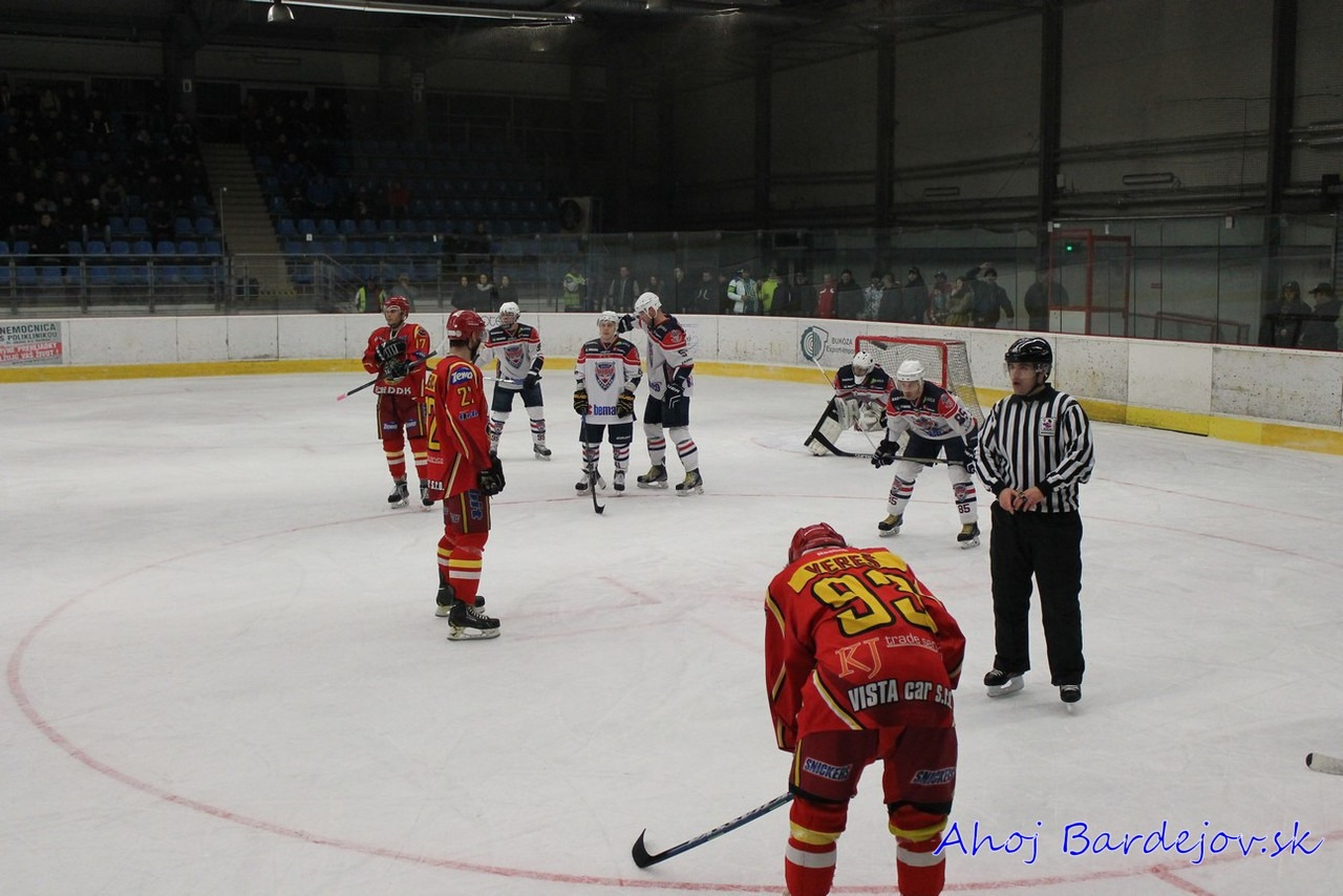 Po zbytočnom faule zo strany hostí prišlo vylúčenie, ktorého koniec prišiel predčasne. Bardejov strelil gól na 1:0 z hokejky Samira Salijiho. Saliji rozohnil spoluhráčov, ktorí začali hrať útočnejší hokej s peknými šancami na zvýšenie náskoku, no všetky šance sa skončili pri vynikajúco chytajúcom Peksovi. Druhú tretinu začalo lepšie domáce družstvo, keď sa im už v 4. minúte podarilo streliť gól na 2:0. Dlho sa však radovať nemohli, kedže už o 20 sekúnd po chybe obrancov Bardejov inkasoval na 2:1.