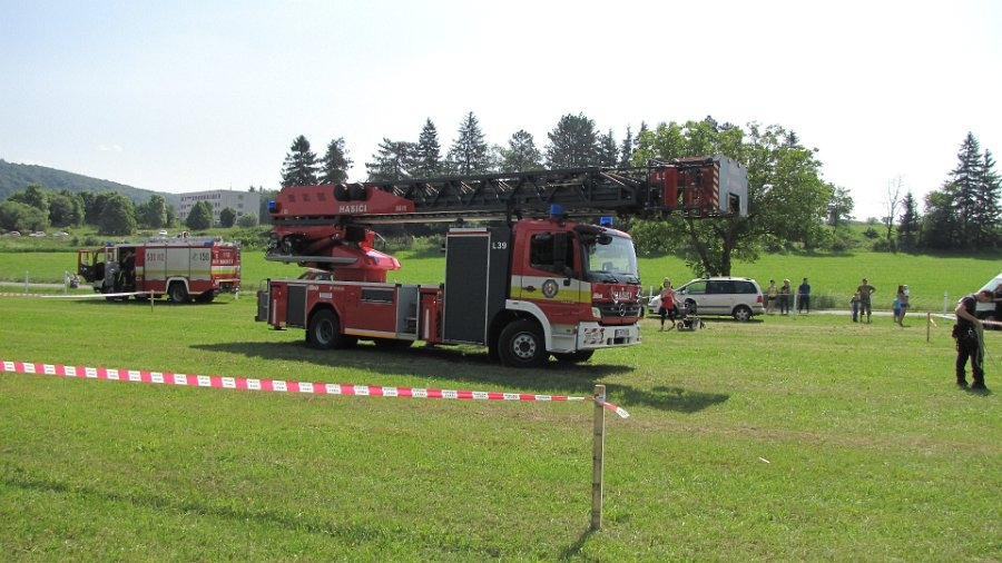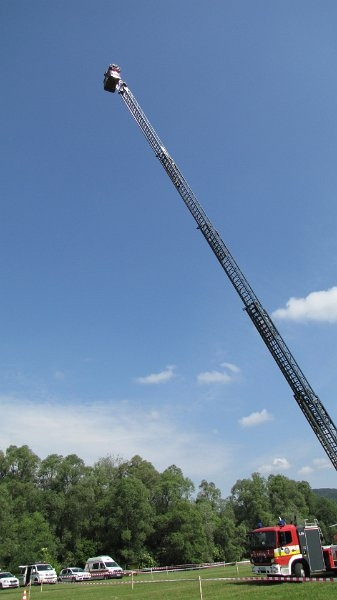 Hasiči ďalej predviedli aj zlaňovanie z koša na rebríku ich služobného vozidla. Rebrík bol vo výške 20 metrov a z neho sa spustil príslušník Hasičského a záchranného zboru (HaZZ). Bola to veľmi náročná akcia, keďže povrch pod vozidlom nebol stabilný. Nakoniec hasiči vysunuli rebrík až do maximálnej výšky 39 m, aj s ľudskou posádkou. „Tento spôsob záchrany je potrebný najmä pri vyslobodení z výškových budov“, uviedol major Pacher.