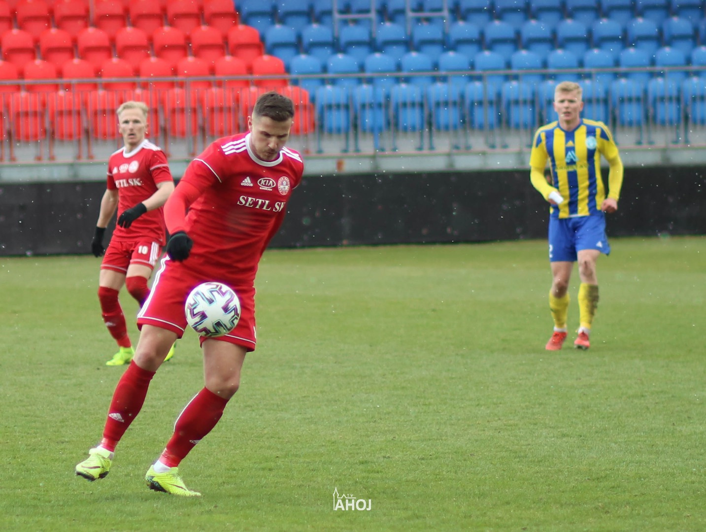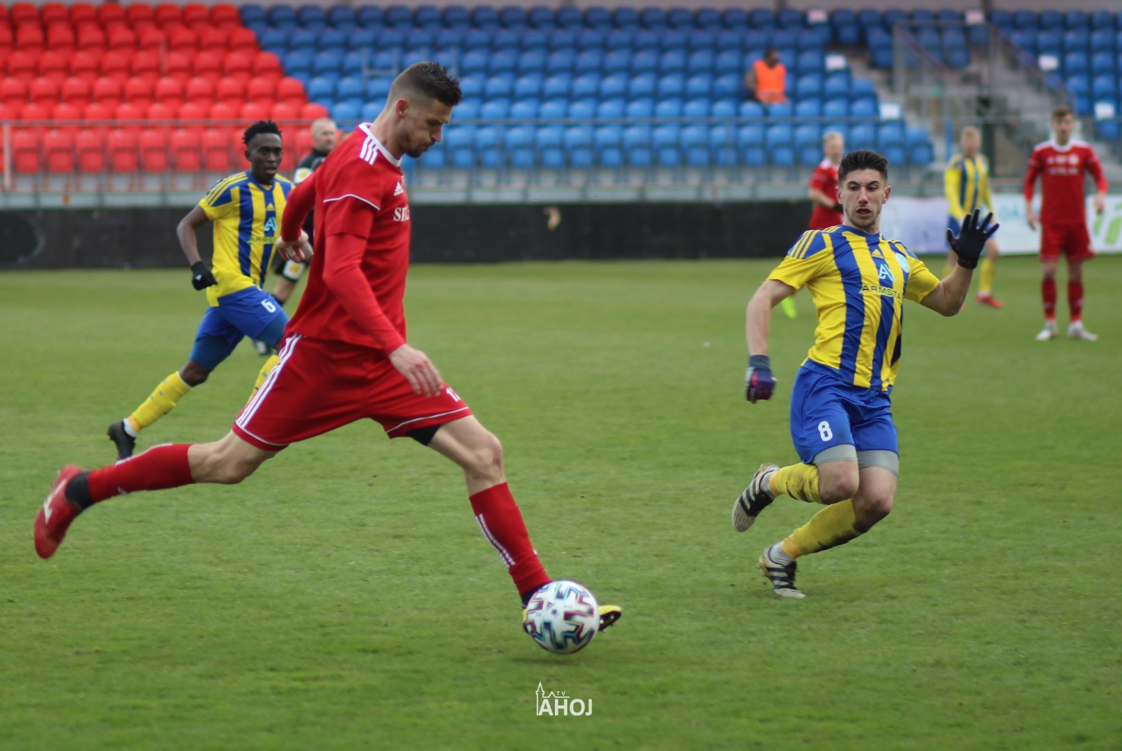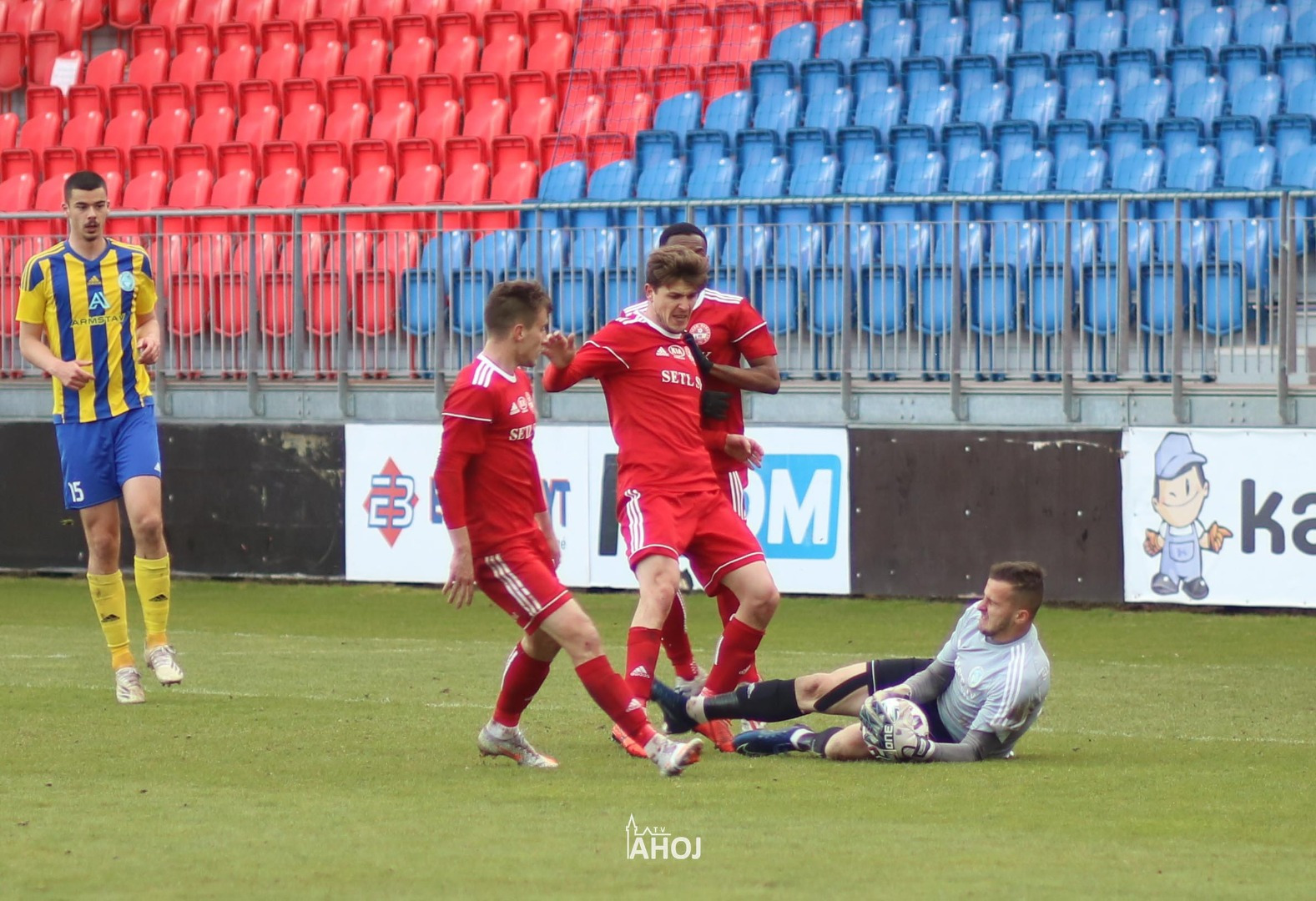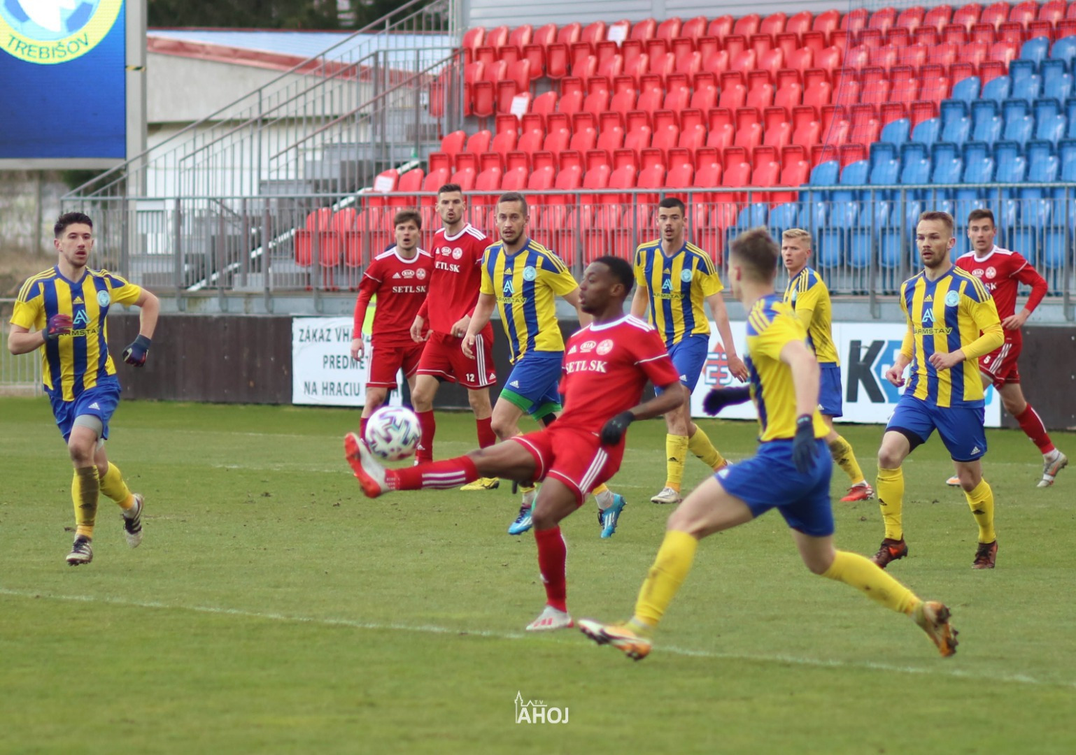 domáci futbalisti hrajúci v červených dresoch a svojho protivníka