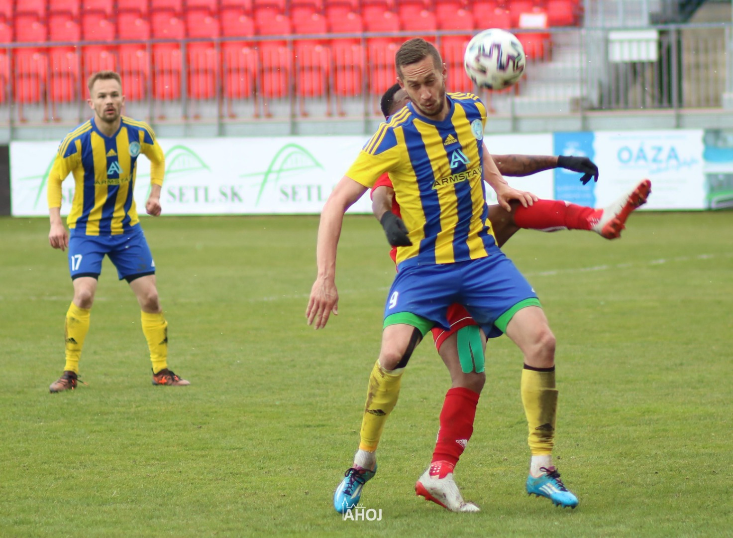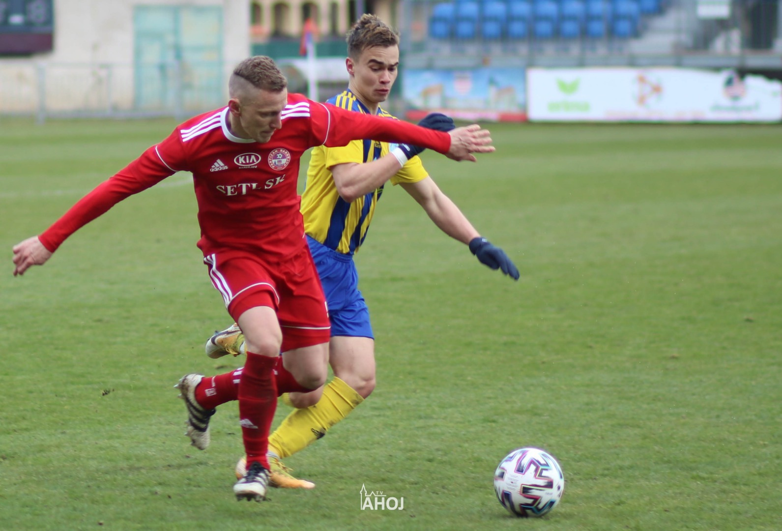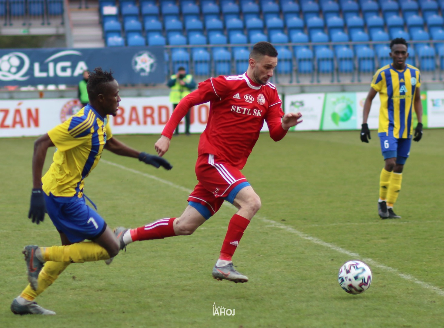 domáci futbalisti hrajúci v červených dresoch a svojho protivníka