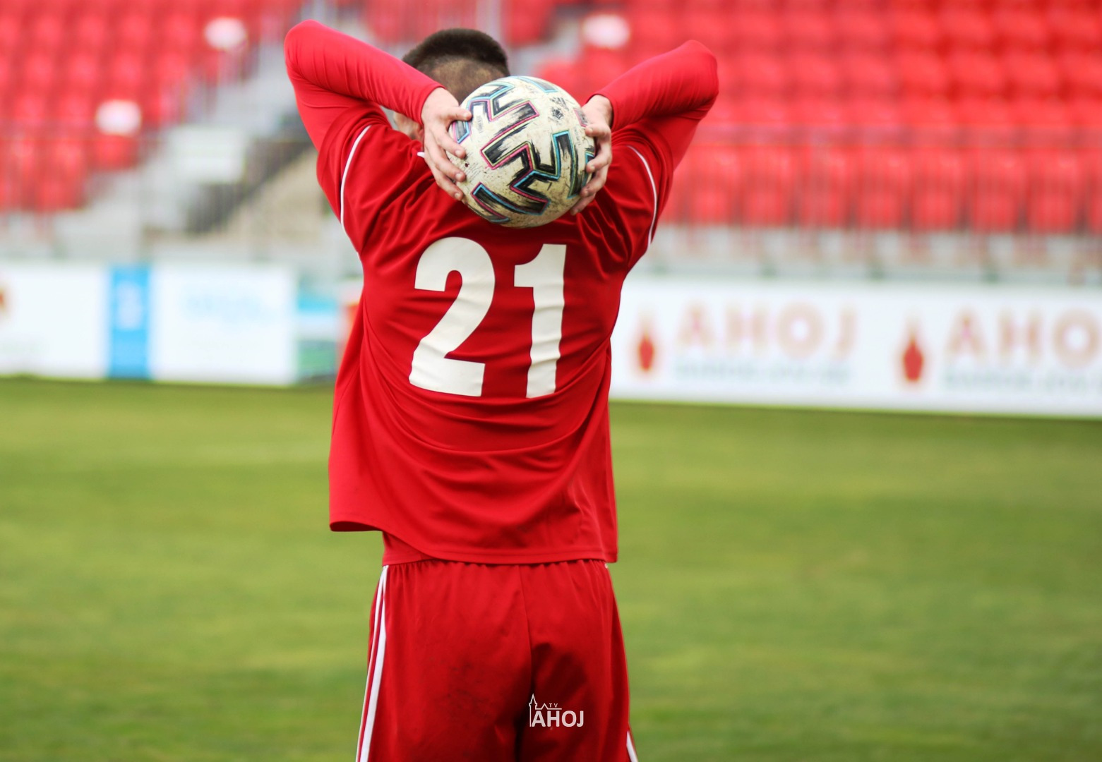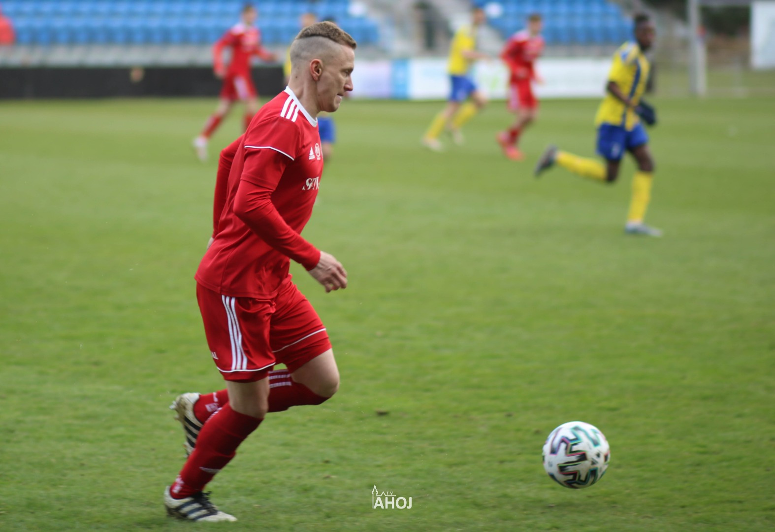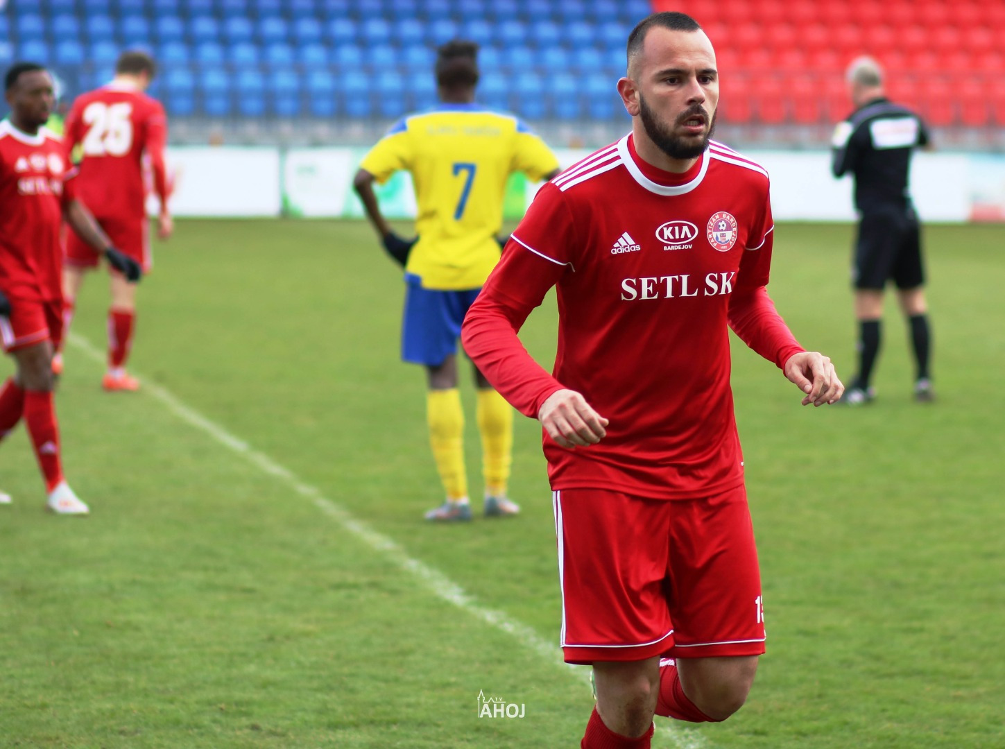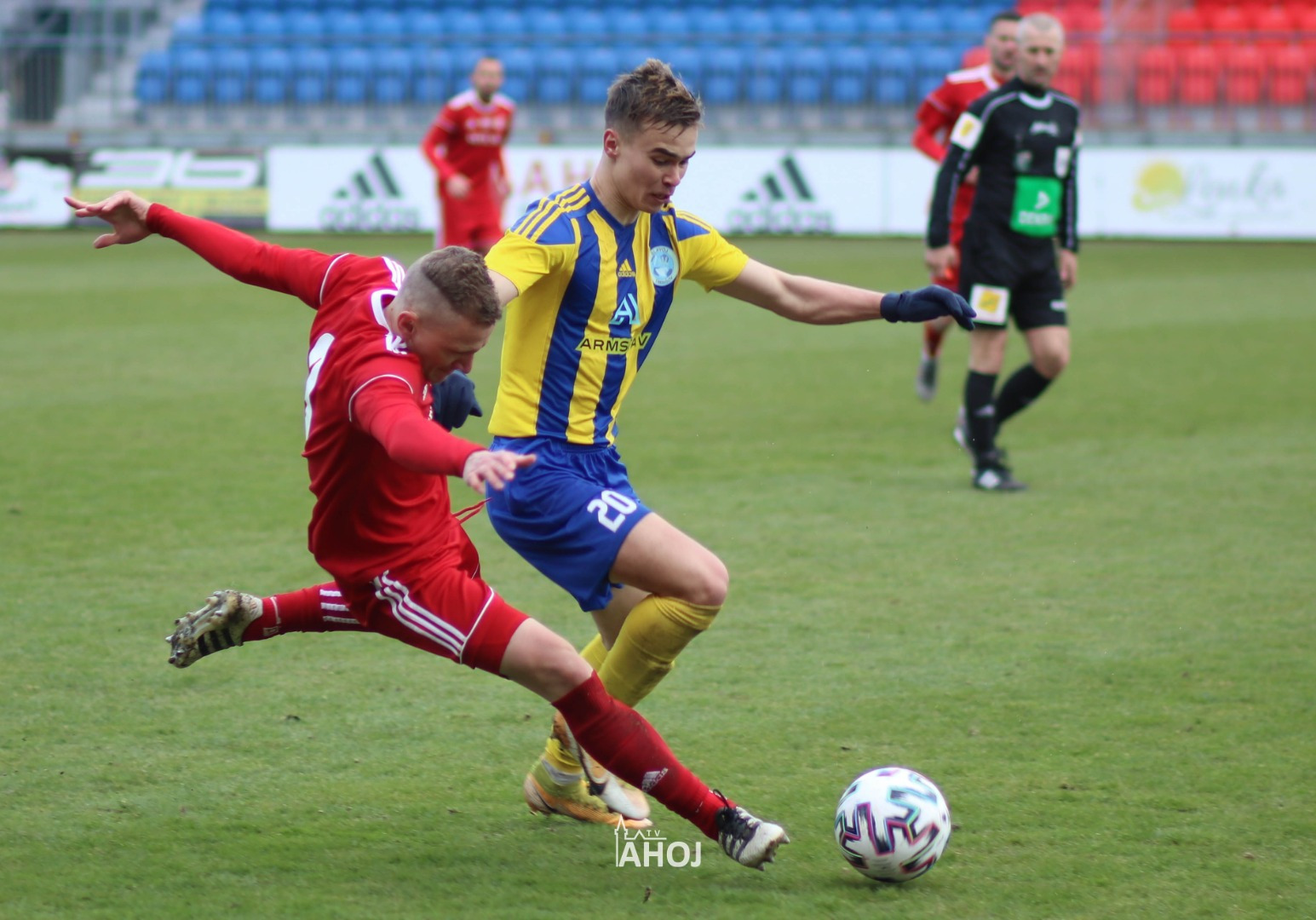 domáci futbalisti hrajúci v červených dresoch a svojho protivníka