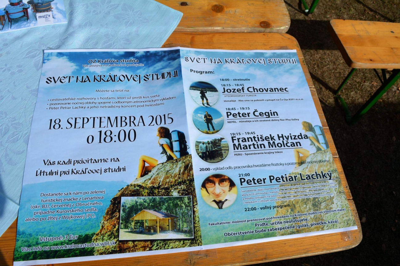 Občianske združenie Kráľova studňa pripravilo jedinečné podujatie pod názvom Svet na Kráľovej studni. Pripravené boli cestovateľské rozhovory s hosťami, ktorí prešli kus sveta, pozorovanie nočnej oblohy spojené s odborným astronomickým výkladom, netradičný koncert pod hviezdami pripravil Peter Petiar Lachký.