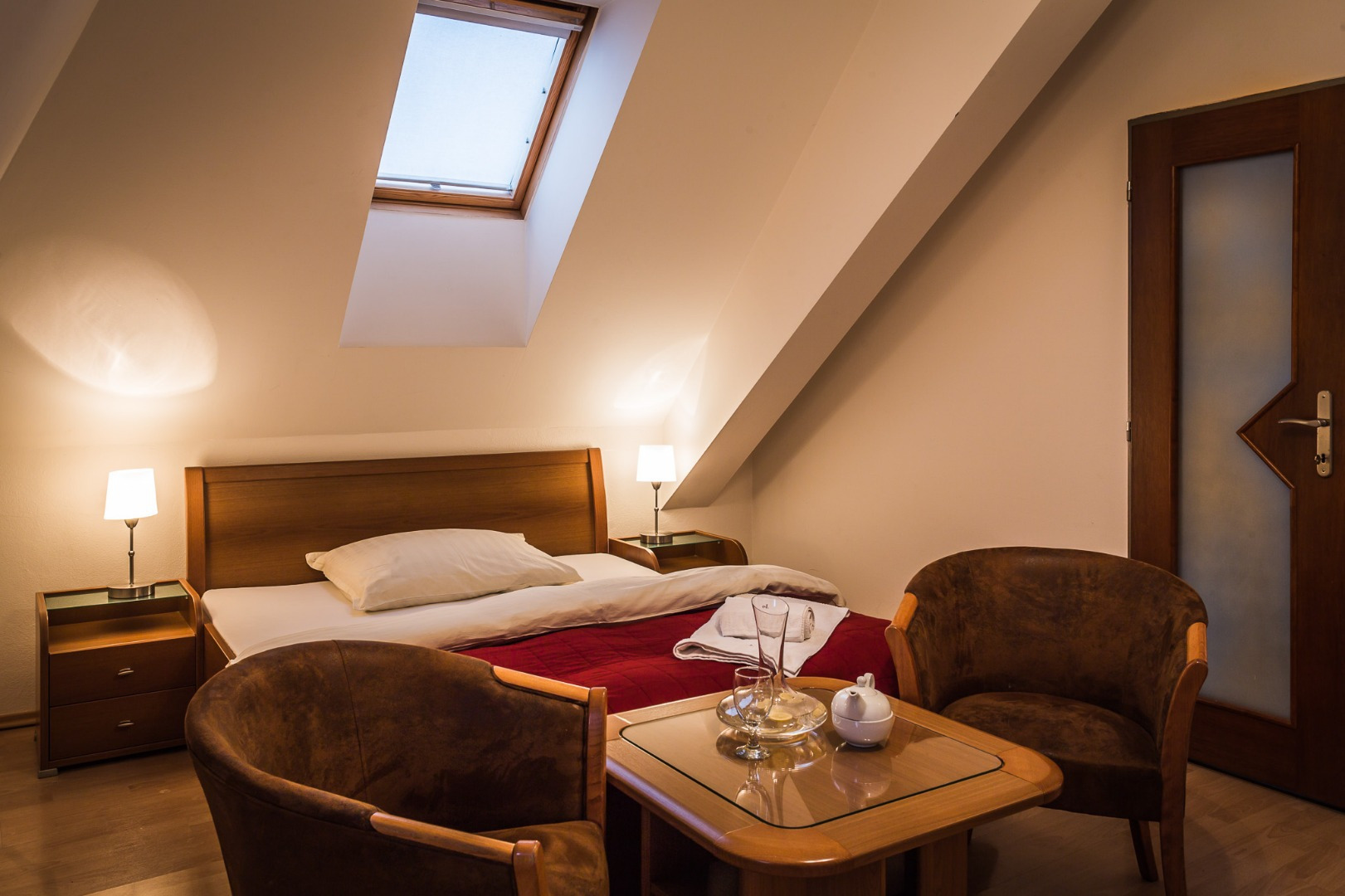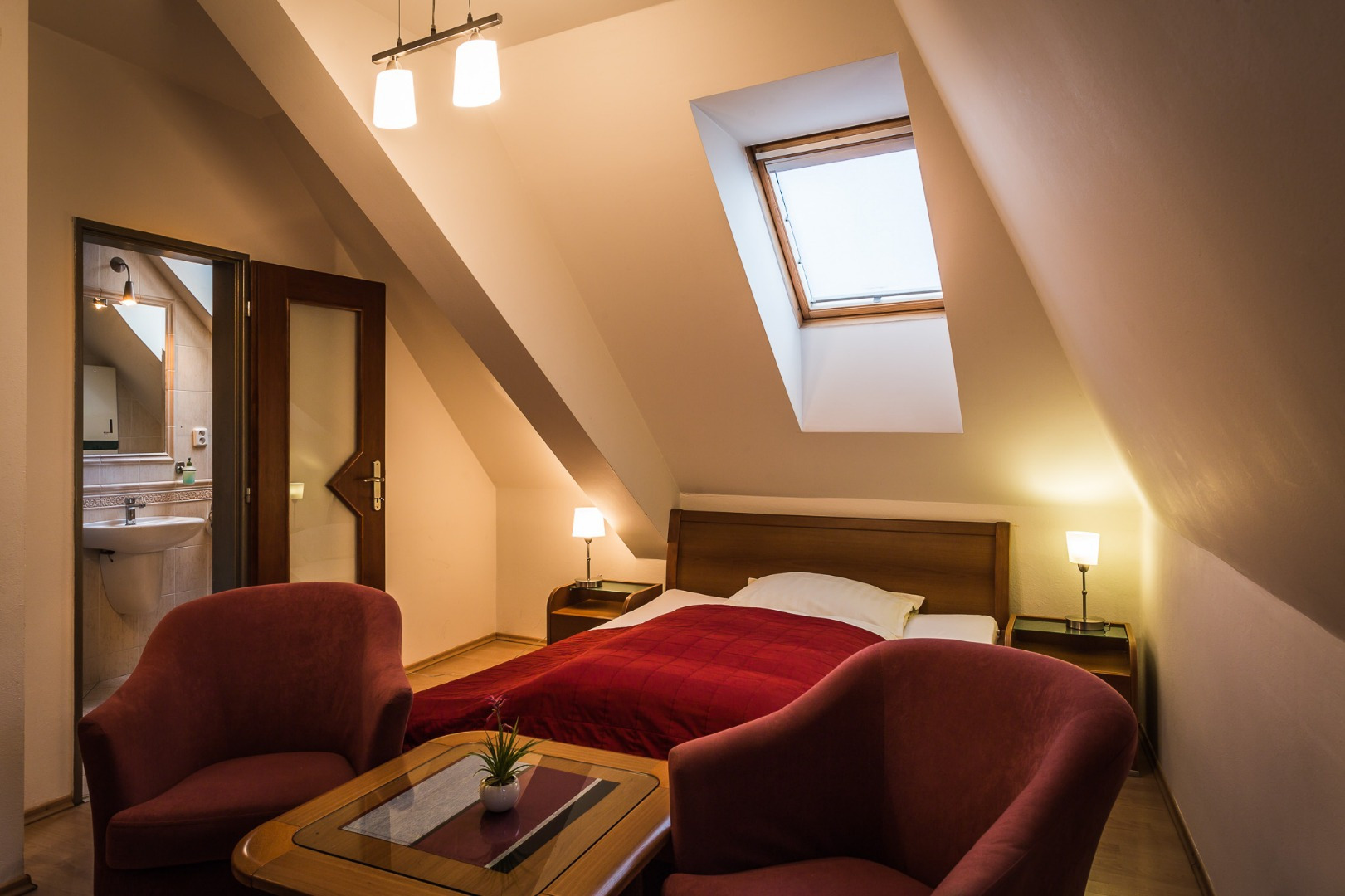 izby s manželskou posteľou, kúpeľňou a WC. K obom izbám patrí malý balkón s