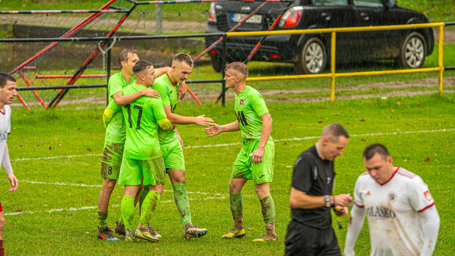zásahu domácich usporiadateľov a tým, že na chvíľu prestalo pršať, mužstvá