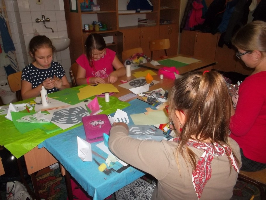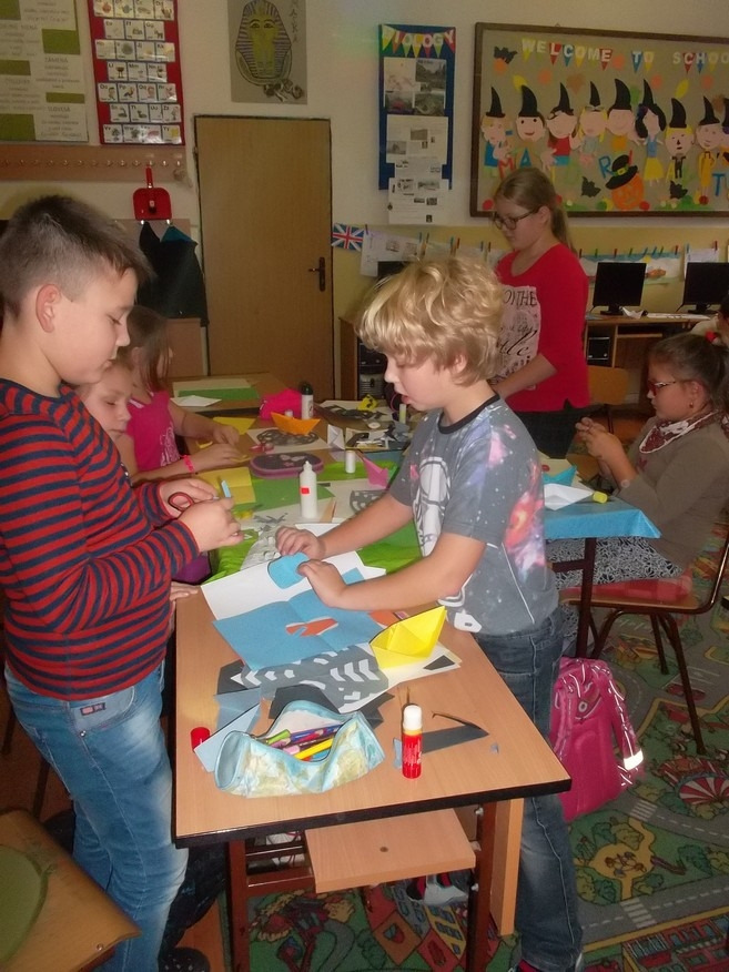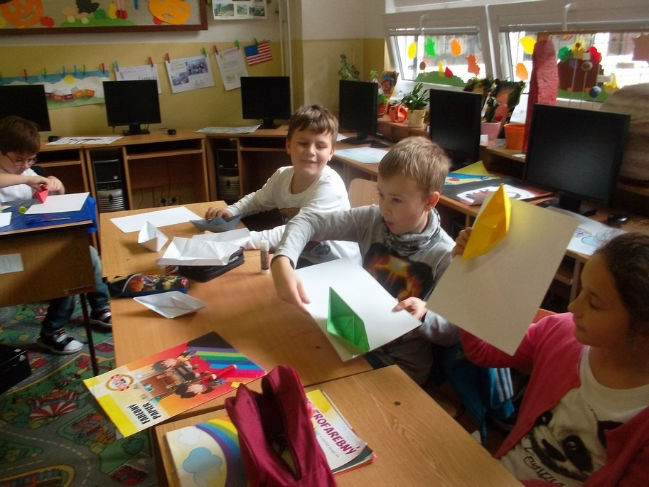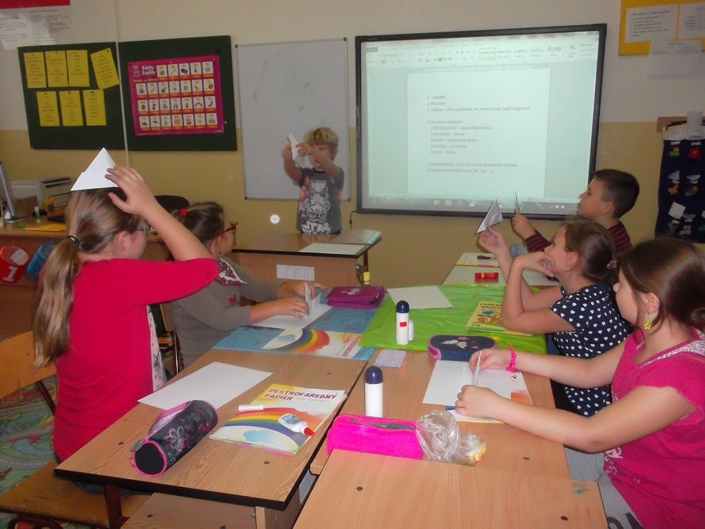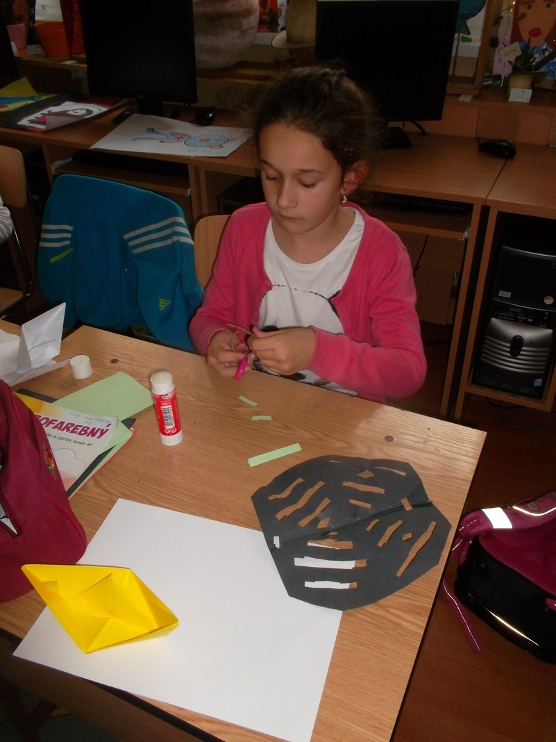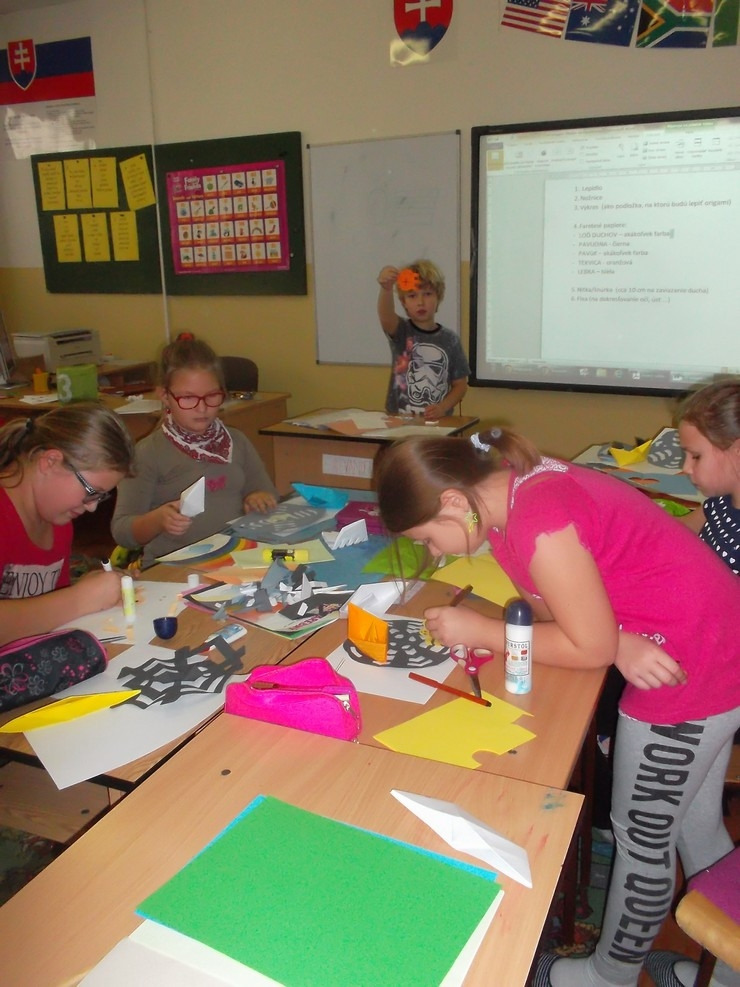 Naučil nás urobiť z papiera loďku, pavúčiu sieť a pavúka. Bol veľmi trpezlivý a všetko nám krok za krokom vysvetlil. Najprv sme si každý origami výrobok precvičili na cvičnom papieri. Až potom sme si pripravili farebné papiere a hotové výrobky nalepili na jeden výkres. Niektorí si loďku a pavúka ešte viac vyzdobili podľa fantázie. Našu triedu tak zdobia originálne origami kompozície. Alexandrova prezentácia bola veľmi pútavá a svoju úlohu učiteľa bravúrne zvládol. Ďakujeme.