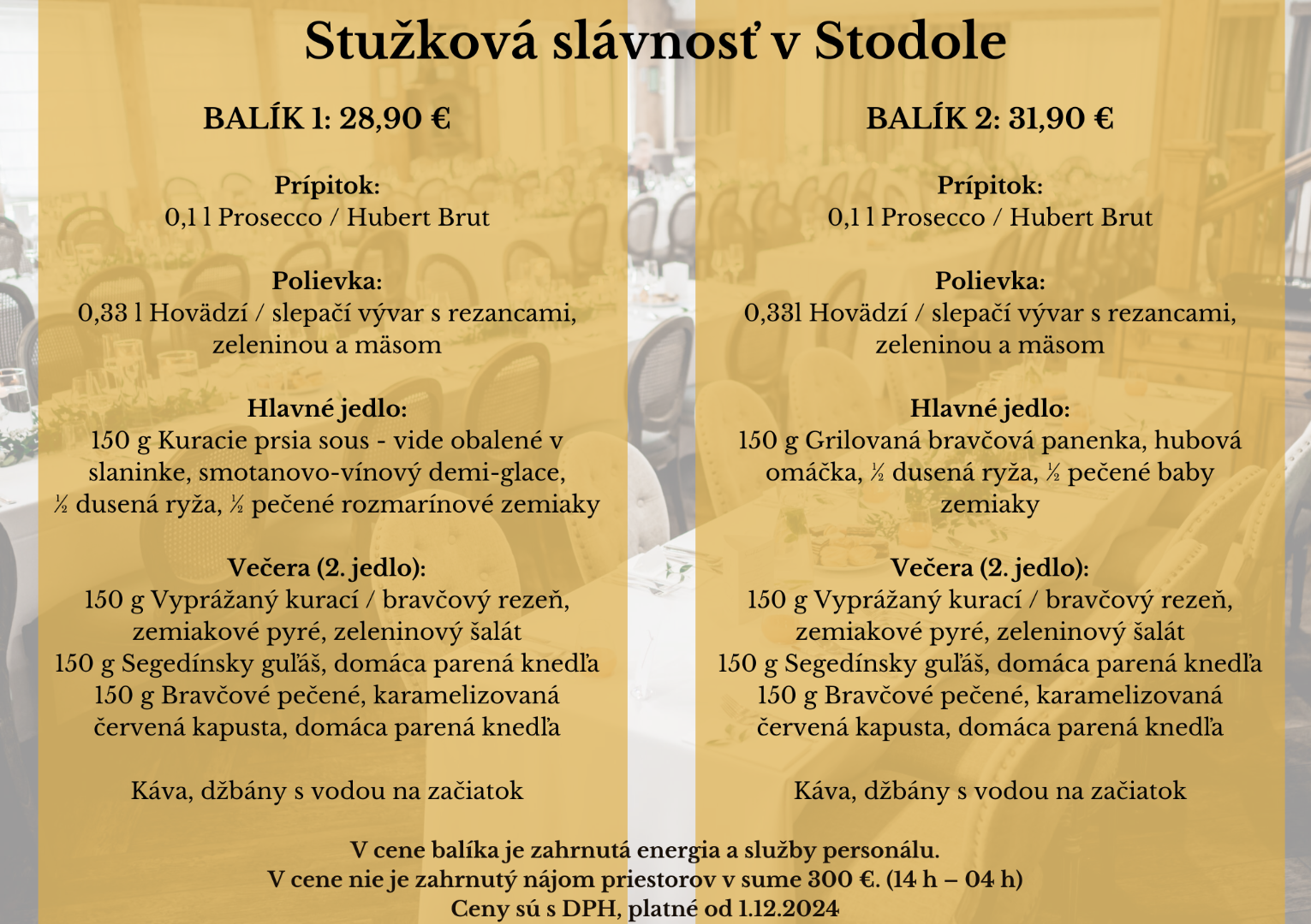 Toto je základný balík reštaurácie na osobu. V cene je aperitív, polievka, hlavné jedlo, druhá večera, káva a džbány s vodou. „Myslím, že je to seriózna a cenovo veľmi lákavá ponuka,“ dodáva manažér reštaurácie.