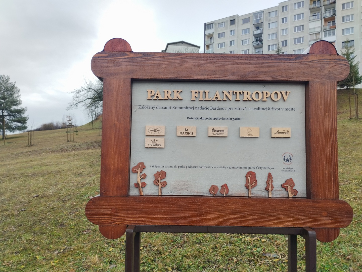 Informačná tabuľa Komunitnej nadácie Bardejov, informujúca o konkrétnych darcov, ktorí kúpou stromčekov podporili založenie a zveľaďovanie Parku filantropov v Bardejove a zároveň skvalitňovanie života v ňom prostredníctvom projektov realizovaných z ich finančných darov. (Foto: Jozef Jarina a Natália Pikhulia)