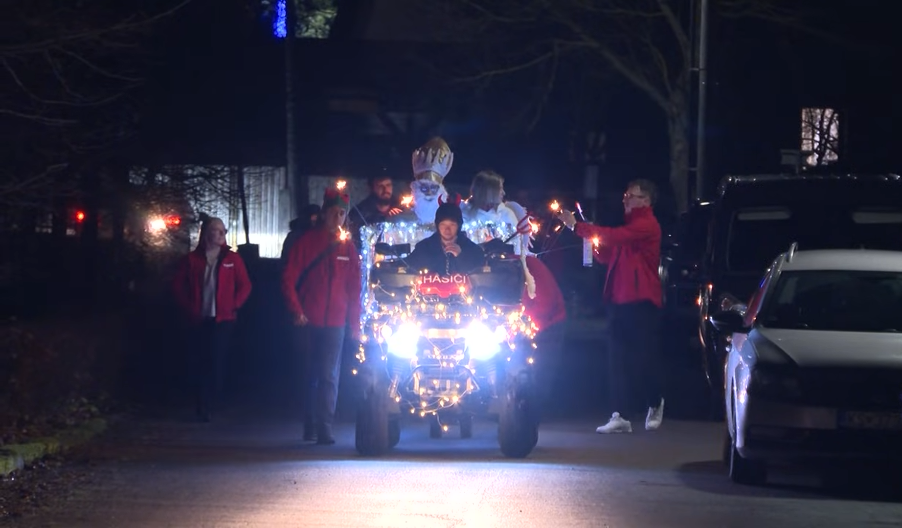Mikuláš dorazil netradične! Čert za volantom a Mikuláš na aute – svetielka svietia a hasiči dohliadajú na bezpečný príchod do Budimíra.