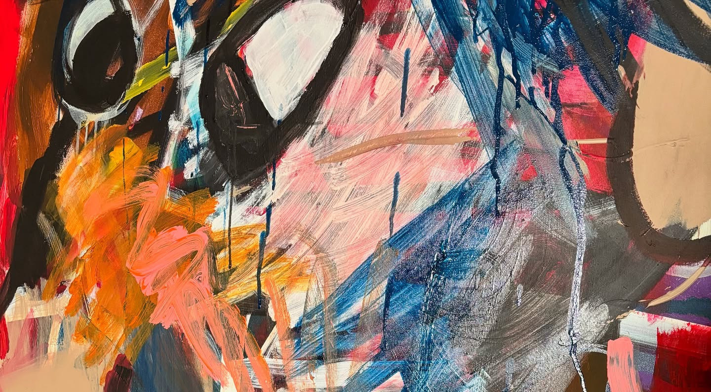 Silueta psa, fragment tváre a červené expresívne plochy pripomínajúce násilie. Aj takýto obraz možno vidieť na výstave Sp\it – Burn with me.