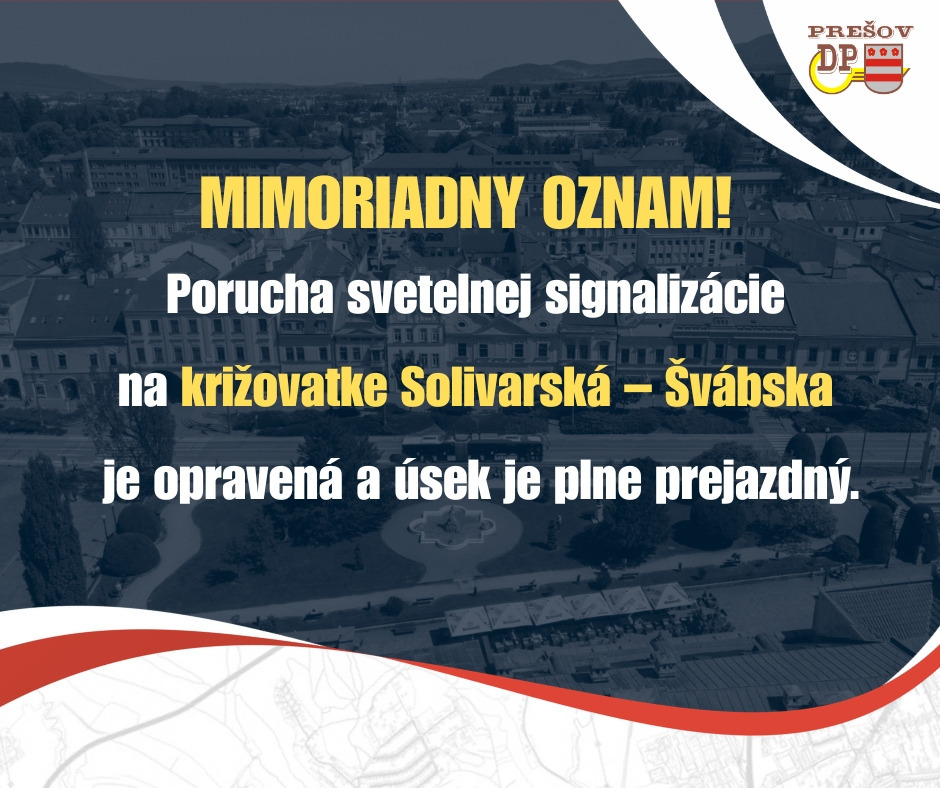 Porucha svetelnej signalizácie na križovatke ulíc Solivarská – Švábska v Prešove bola odstránená a úsek je opäť plne prejazdný.