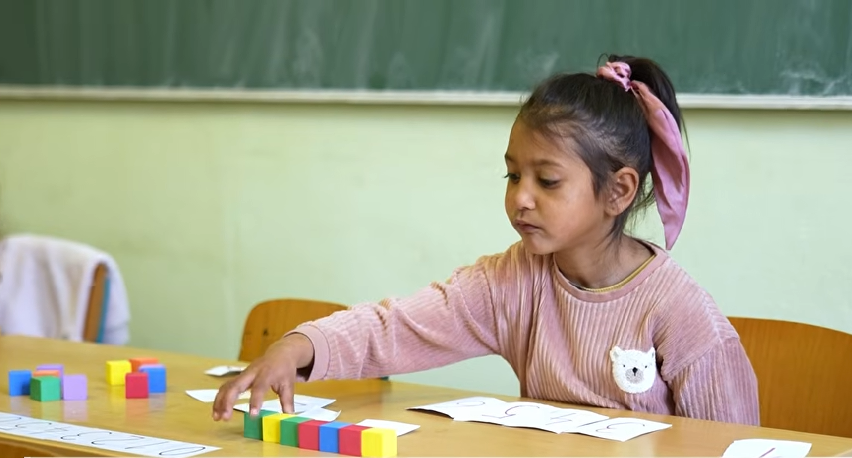 Pri matematike si žiaci pomáhajú konkrétnymi pomôckami, napríklad kockami, ktoré im uľahčujú pochopenie učiva.