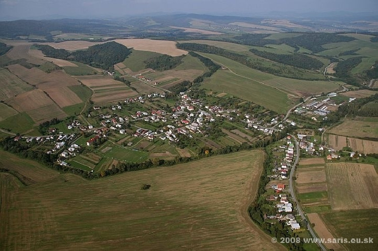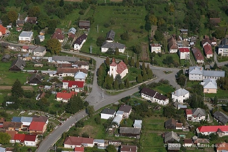 Kostol je postavený uprostred dediny a oproti je fara (župný archív).
