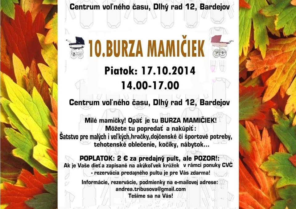 Ak teda ani vy nechcete strácať drahocenné minúty dlhými nákupmi v obchodných centrách, ale stráviť ich so svojimi deťmi, Burza mamičiek v piatok 17. októbra v čase od 14.00 do 17.00 hod. v priestoroch Centra voľného času v Bardejove, je to pravé miesto, kde jednorazovou návštevou ušetríte čas i peniaze. A ak tušíte o niekom, komu by piatkový nákup taktiež padol vhod, jednoducho pošlite zvesť o akcii ďalej tak, aby sme spoločne mohli nulu na jubilejnej desiatke rozkotúľať čo najďalej.