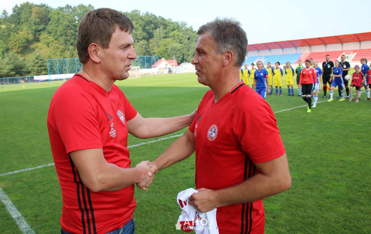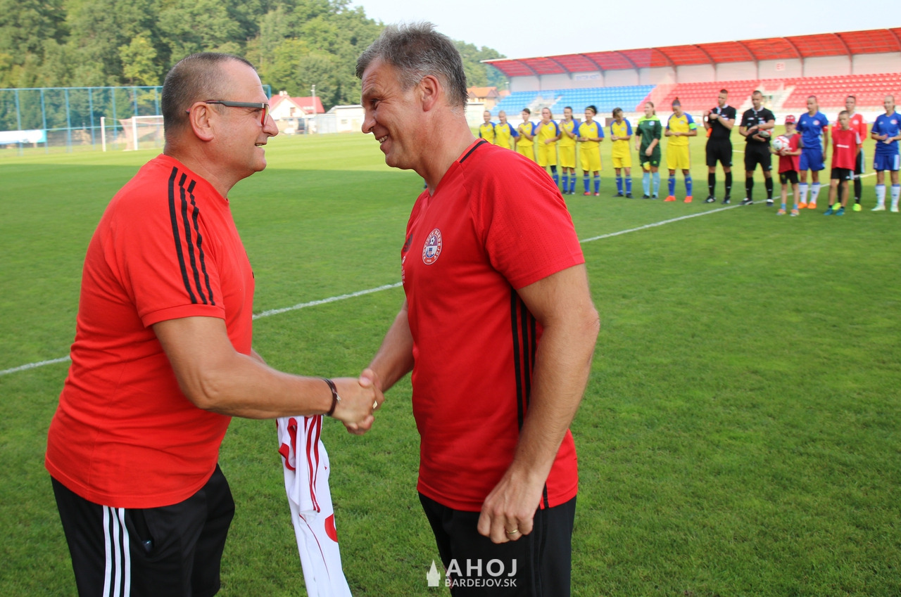 Koordinátor ženského futbalu v Bardejove František Kuľka (vľavo) gratuluje trénerovi Ľubomírovi Čekanovi k okrúhlemu jubileu